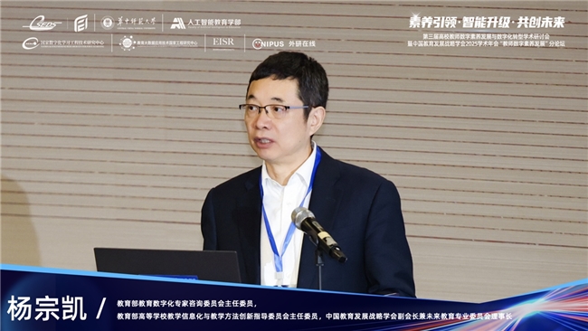 教育部教育数字化专家咨询委员会主任委员,教育部高等学校教学信息化与教学方法创新指导委员会主任委员,中国教育发展战略学会副会长兼未来教育专业委员会理事长杨宗凯首先为大会致开幕词。他回顾了我国推进数字化教育的重大举措,指出在智能时代背景下,教师角色的转型与能力提升是核心关键,亟需提升数字素养、转变教学角色、增强专业能力,以适应智能技术引领的教育变革。他期待本次研讨会能够结合教育理论与科研实践,展开充分交流,主动求变以应对时代挑战。