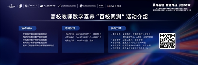 响应教育部《关于组织实施数字化赋能教师发展行动的通知》,为助力各高校掌握校本教师数字素养发展现状,构建完善教师数字素养画像,沉淀校本教师发展大数据,探索数据驱动的教师数字素养提升路径,推动基于真实数据、立足真实场景的教师发展提升机制变革,助力国家教育数字化战略深入实施,外研在线联合教育部教育数字化战略研究基地(华中),面向各本科、高职院校,特别发起高校教师数字素养“百校同测”活动。